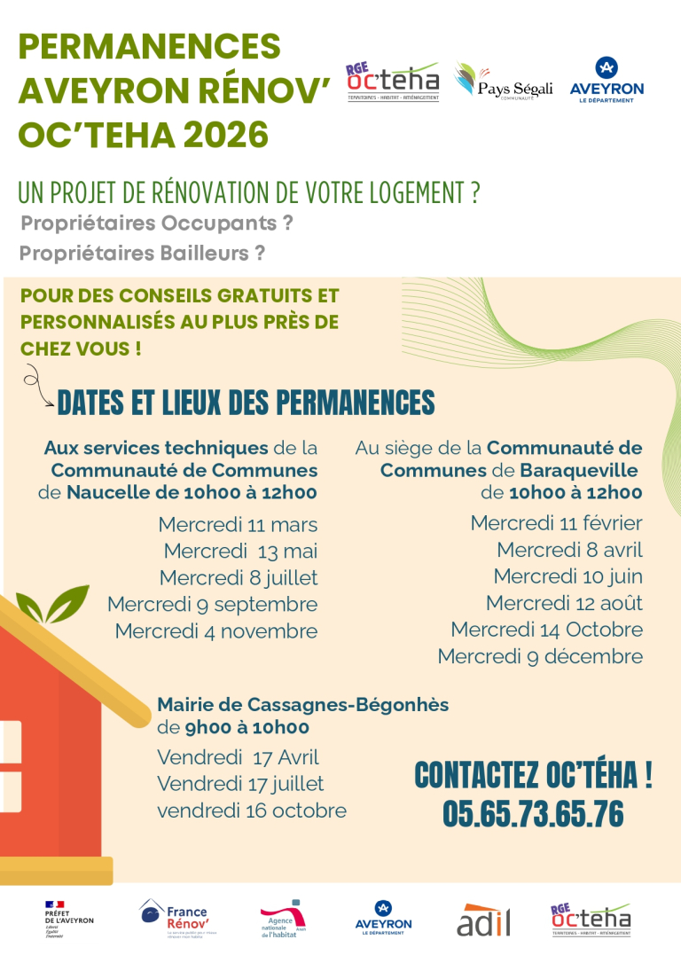 Pour tout renseignement ou pour prendre rendez-vous à ces permanences, veuillez contacter OC’TEHA au 05.65.73.65.76